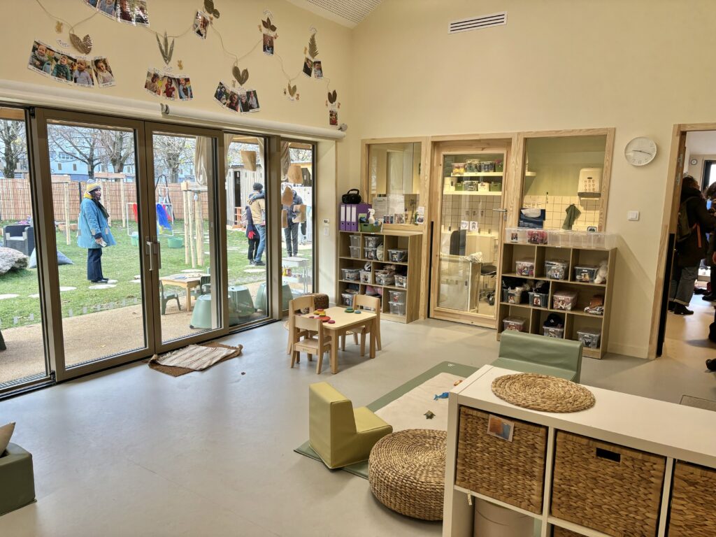 Inspirée de la pédagogie scandinave, la crèche mise sur le contact permanent avec l’extérieur. Sur une parcelle de 485 m², les enfants évoluent dans un espace arboré, jouent, explorent, déjeunent et font la sieste en plein air.