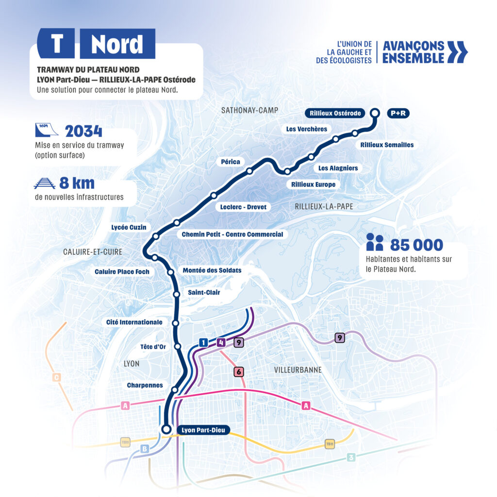 Bientôt un nouveau tramway au Nord de Lyon ? C’est en tout cas le projet de Bruno Bernard, candidat à sa propre succession à la tête de la Métropole de Lyon. Son projet est de créer un nouveau tramway long de 8km sur secteur Nord de la Métropole de Lyon en reliant la Part-Dieu à Rilleux-la-Pape, en passant par la ville de Caluire-et-Cuire, en seulement 25 minutes.
