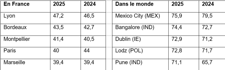 Et pour la première fois, Lyon est la ville où le taux de congestion a été le plus élevé, avec un indice de 47%.