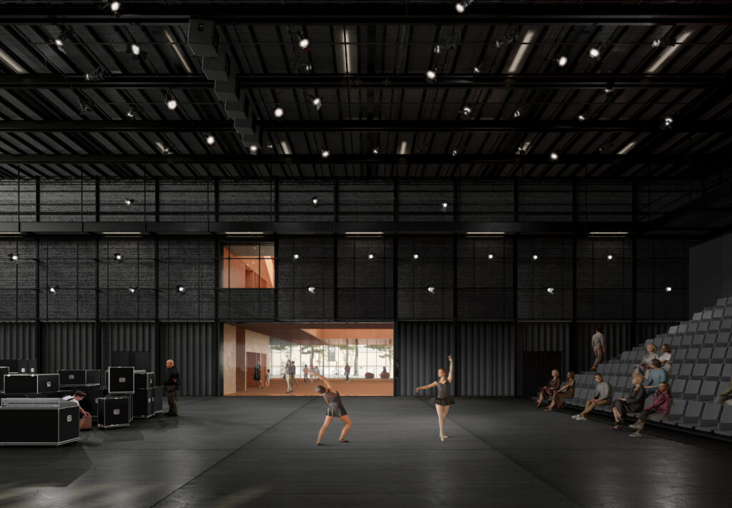 À l’intérieur, le hall se déploie sur deux niveaux autour d’un espace de convivialité qui s’ouvrira sur une terrasse. Les studios promettent une acoustique soignée et des équipements qui permettent d’adapter facilement l’espace selon les besoins. L’un d’entre eux pourra même doubler de superficie grâce à une paroi coulissante.